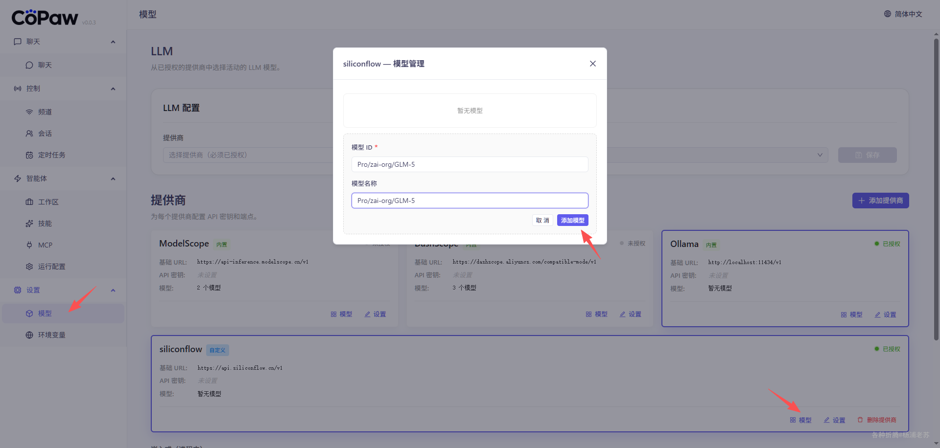 模型 ID:例如Pro/zai-org/GLM-5模型名称:可以是一样的,例如Pro/zai-org/GLM-5