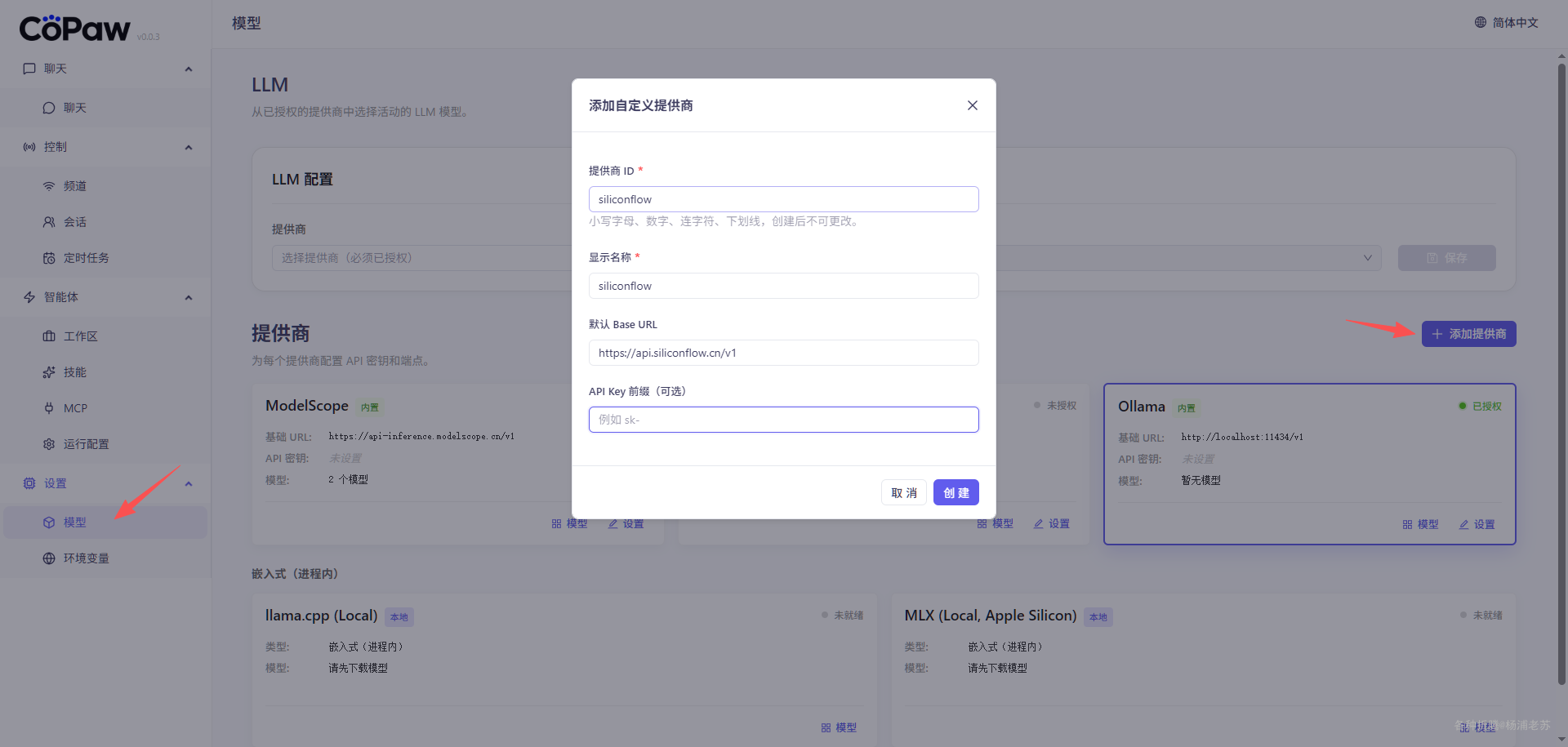 提供商 ID:小写字母、数字、连字符、下划线,创建后不可更改。例如硅基流动可以是siliconflow显示名称:如果你和老苏一样懒,可以直接复制,或者直接用中文硅基流动默认 Base URL:硅基流动的地址是https://api.siliconflow.cn/v1API Key 前缀(可选):虽然硅基流动的key正好是sk-开头的,但老苏建议留空