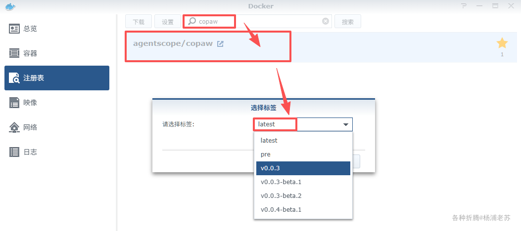 在注册表中搜索 copaw ,选择第一个 agentscope/copaw,版本选择 latest。