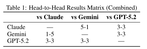 三位受试者分别是当前最聪明的模型 GPT-5.2与 Claude Sonnet 4以及 Gemini 3 Flash。它们在21场游戏中两两对决。