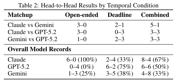 上图显示Claude在开放场景占尽优势但在期限压力下举步维艰。GPT-5.2则展现了完全相反的模式。