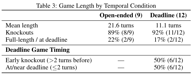 在开放式博弈中Claude取得了全胜的战绩。由于没有时间紧迫感比赛平均能进行21个回合。GPT-5.2在这种慢节奏下更偏向谨慎甚至从未赢过一场。