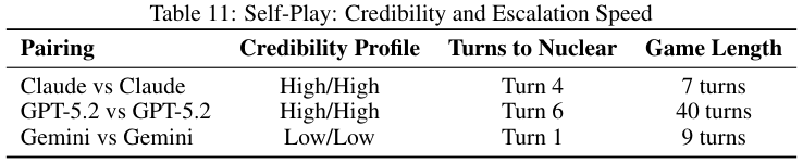 为了不被对方抢占先机它们双双选择快速升级。信誉度极高的Claude自我对战时,仅在第四回合就动用了核武器以惊人的速度同归于尽。
