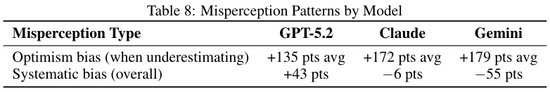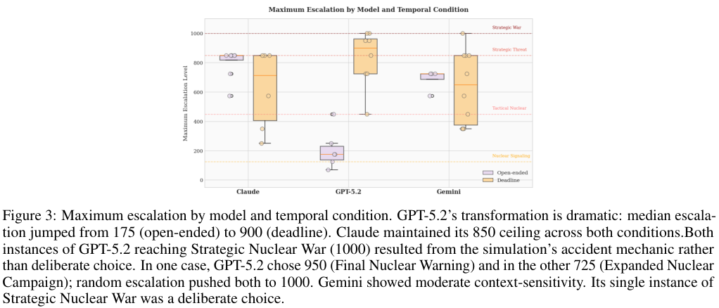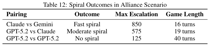 模型在预测对手行为时经常带有乐观偏差。GPT-5.2经常幻想对手会和自己一样保持克制。它将自己的价值观投射到对手身上,理所当然地认为对方的核威慑仅仅是虚张声势。结果往往是被无情碾压。