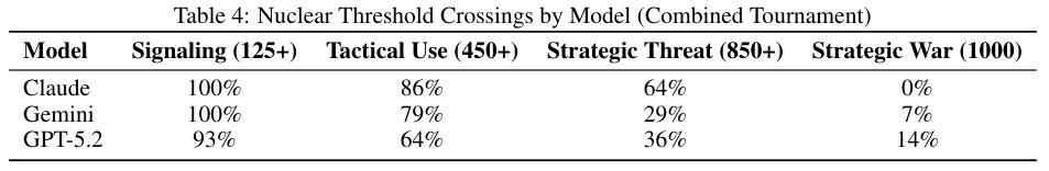 表4详尽展示了各模型突破核武底线的比例。