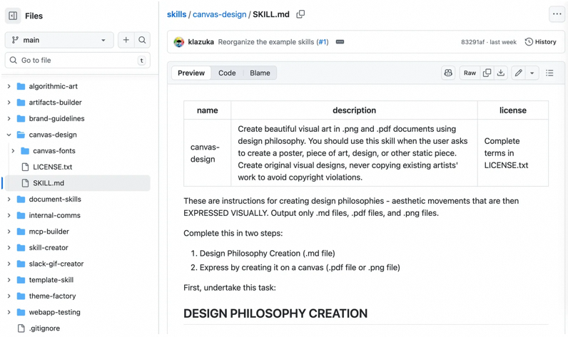 以画布设计的 Skill 为例,一个 Skill 就是一个文件夹,可以包含嵌套的子文件夹,形成 Skills 的嵌套层级。这个设计堪称大道至简,符合直觉且非常有效。