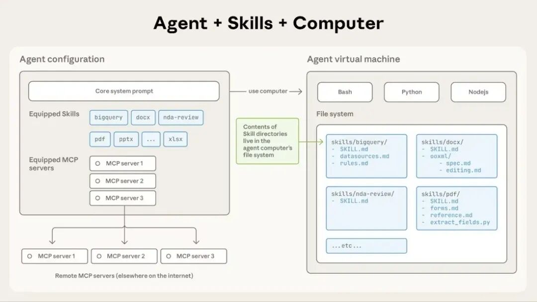 - Claude Skills 是一种基于文件系统的、可复用的知识包,运行在 Claude 的沙盒虚拟机(VM)环境中,用于向 Agent 注入流程化、确定性的内部知识(SOP)的标准化方案。