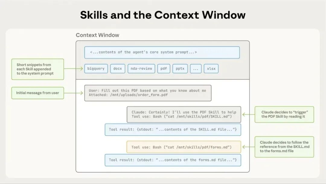 只有在这个时候,Skill 的核心指令和工作流程才会进入上下文窗口。Claude 开始学习如何完成这项具体任务。
