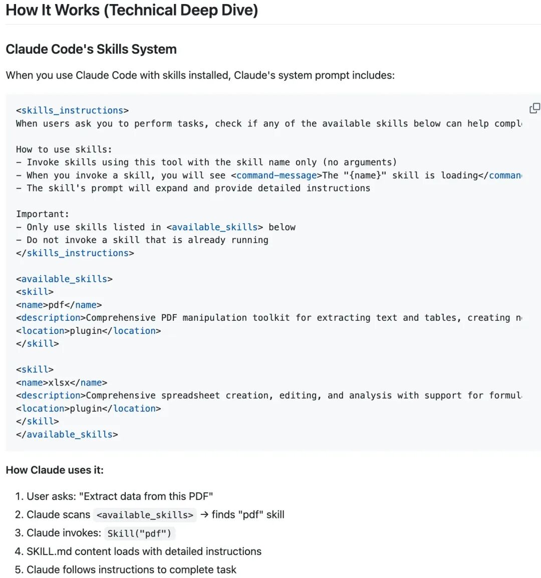 提供了一个与 Claude 官方近似的实现,思路非常直观,把 skills 写入 AGENTS.md 中,然后 Agent 可以通过 Bash("openskills read pdf")进行调用,这种方案可以支持 Claude Code 之外的其他 Agent,例如 Qwen Code、Codex 等。