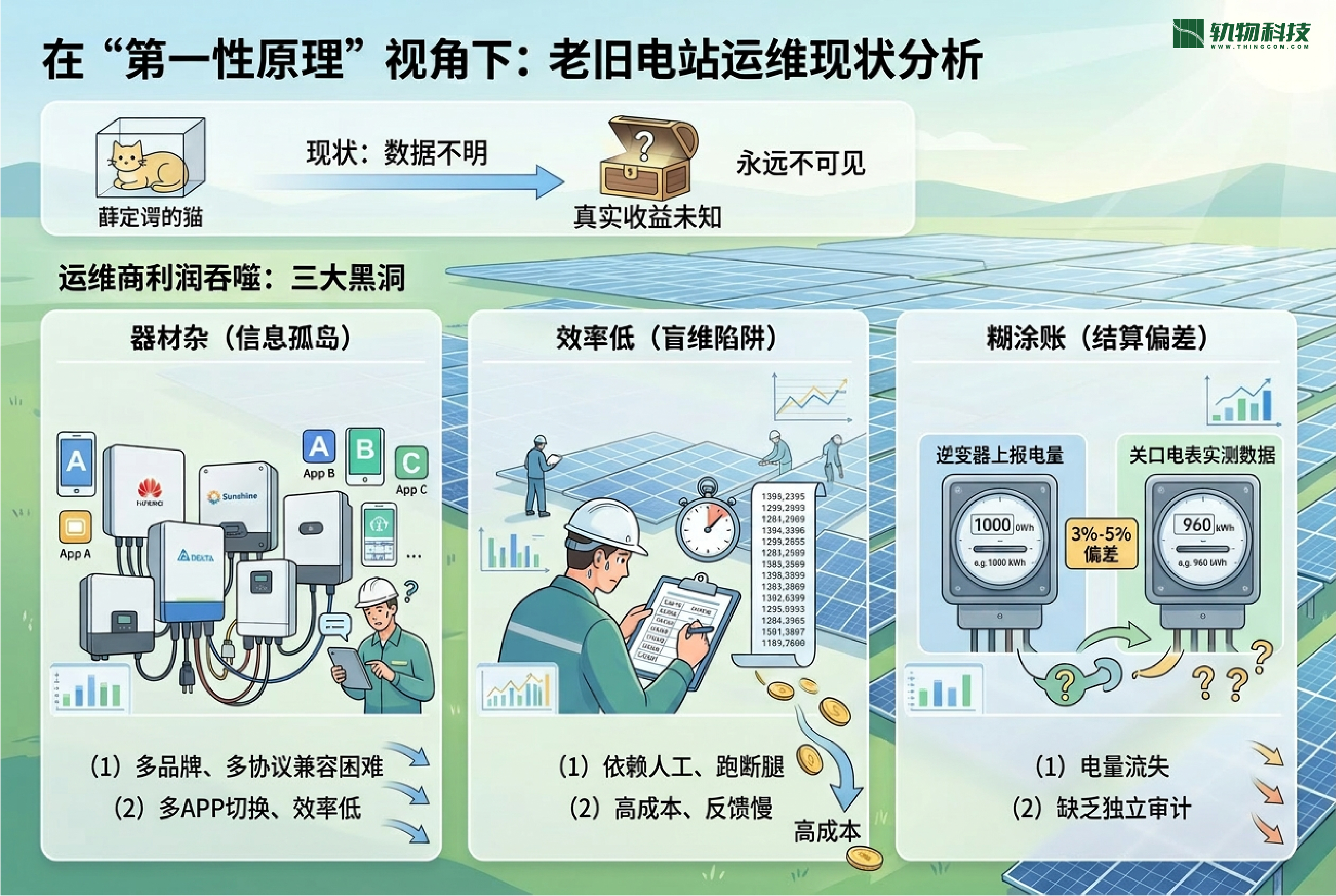 在“第一性原理”视角下,老旧电站的运维现状如同“薛定谔的猫”:在缺乏物理层直采数据审计之前,真实的收益真相永远处于不可见的叠加态。目前,运维商的利润正被三个“黑洞”吞噬: