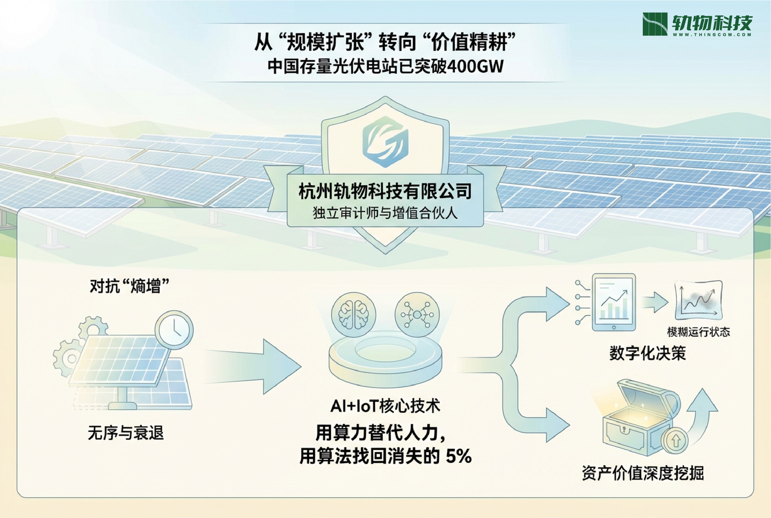 截至 2026 年,中国光伏存量市场规模已跨越 400GW 门槛。作为一名深耕 AIoT 领域的高新技术企业,轨物科技观察到光伏资产正面临严重的物理性“熵增”——随着 25 年生命周期的推移,早期电站不可避免地陷入设备老化、效率衰减、2G 退网导致的“数据失联”以及运维成本攀升的系统性困境。