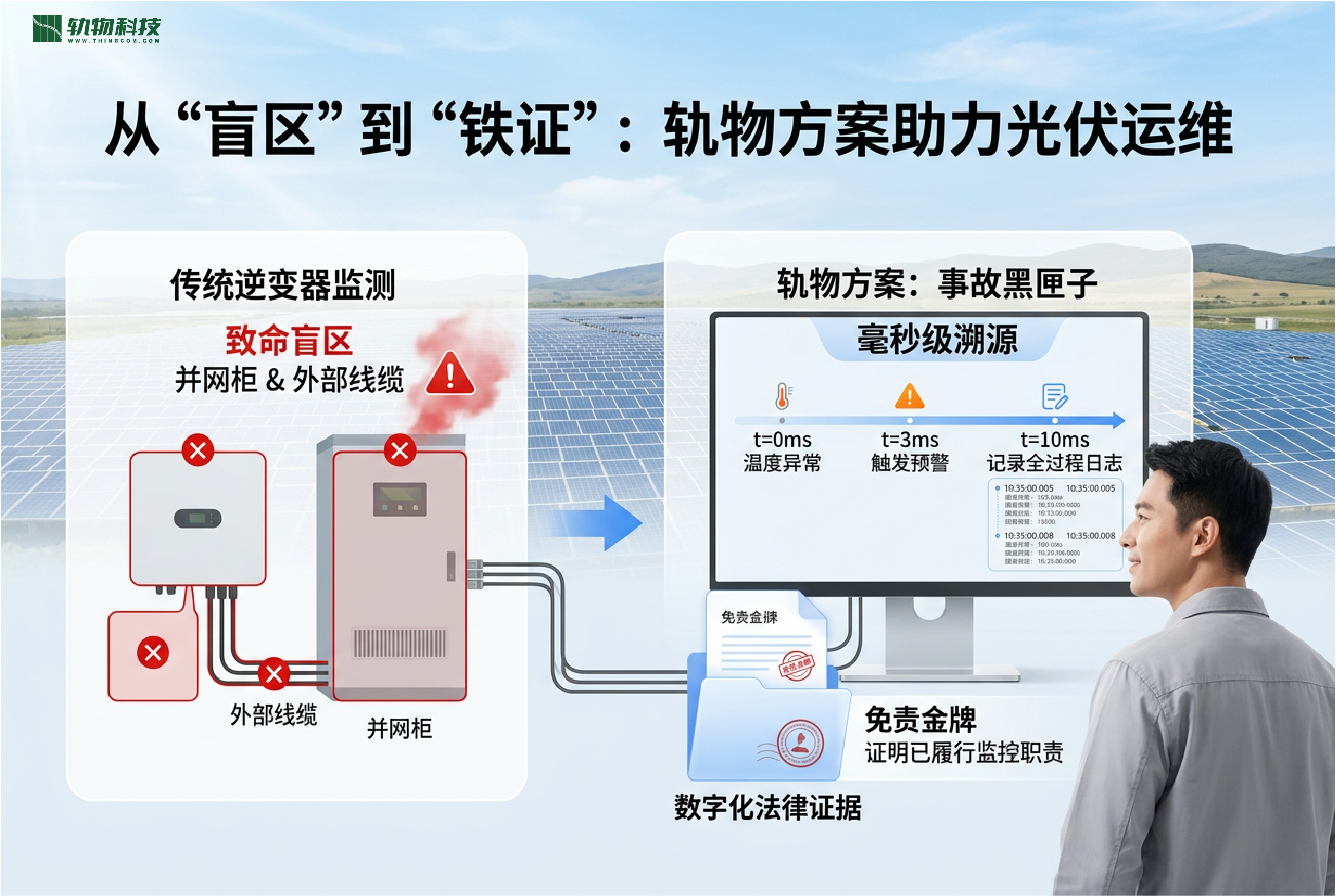 传统逆变器监测仅覆盖内部环境,对并网柜及外部线缆的健康状态存在致命盲区。对于运维商而言,除了火灾损失,更深层焦虑在于事故后的定责压力。轨物方案通过“事故黑匣子”提供毫秒级溯源,记录从温度异常到触发预警的全过程日志。这种“数字化法律证据”是运维商在证明已履行监控职责时的“免责金牌”。