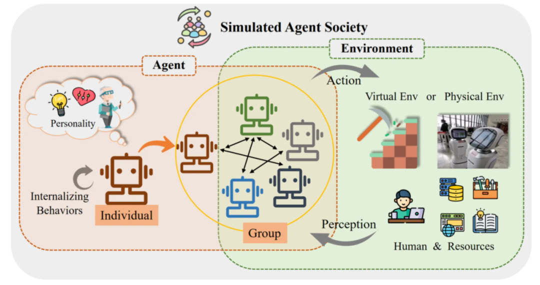 - 中间部分:是多agent,单个代理可以与其他代理个体组成群体,共同展现出合作等群体行为,例如协同合作等。