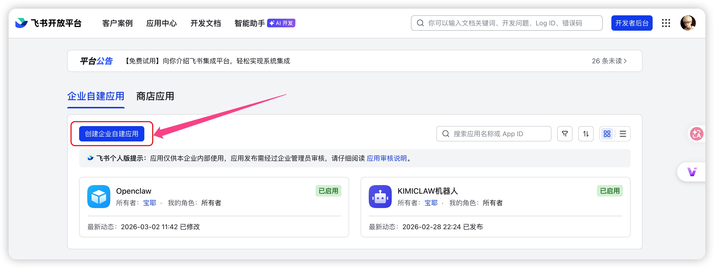 - 点击页面右上角的 “创建企业自建应用”