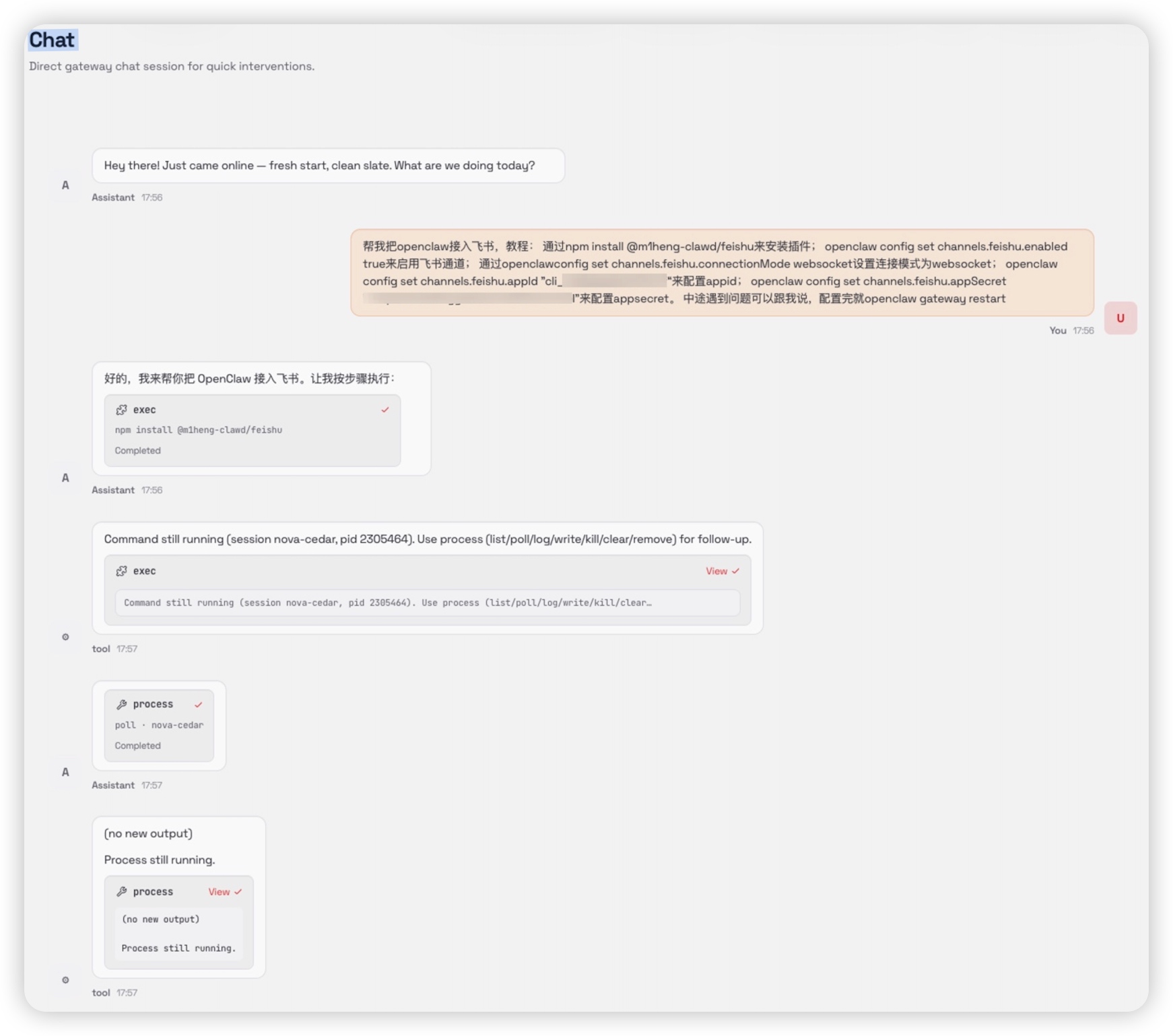 所有配置完成后,最后一步是启动 OpenClaw 的网关服务,让它开始监听飞书消息: