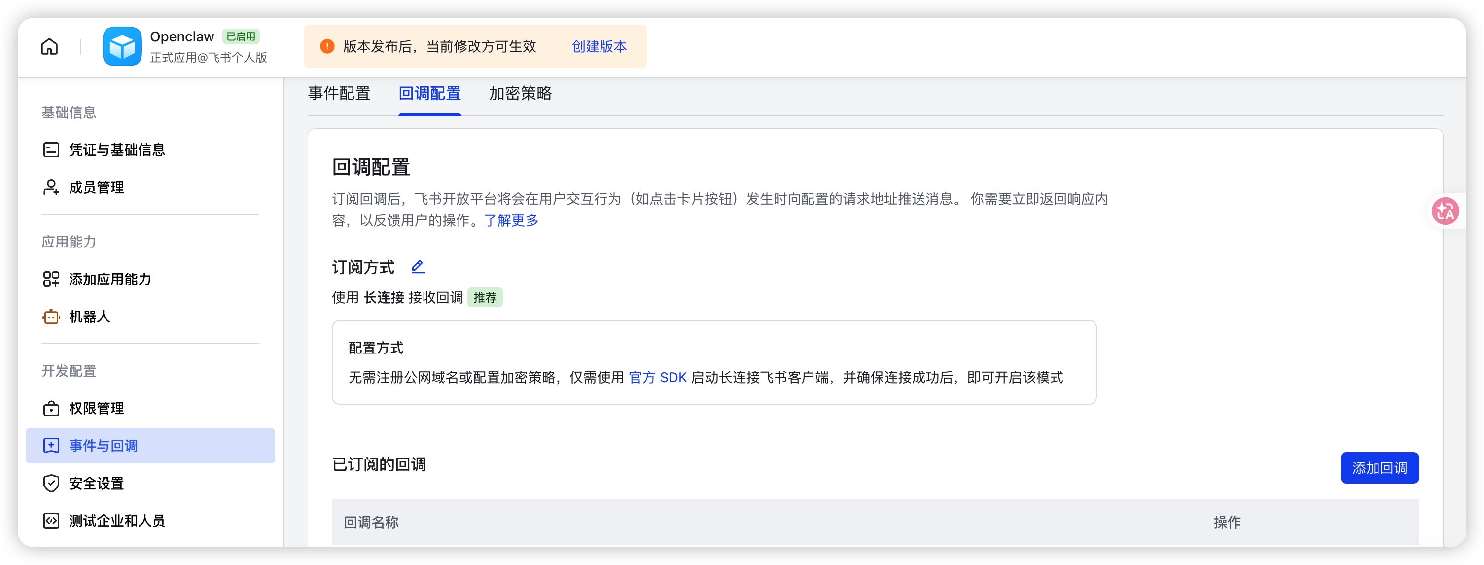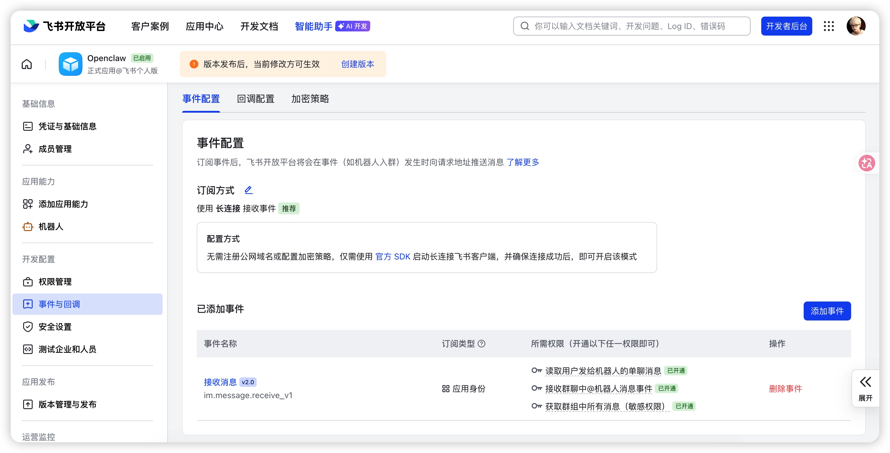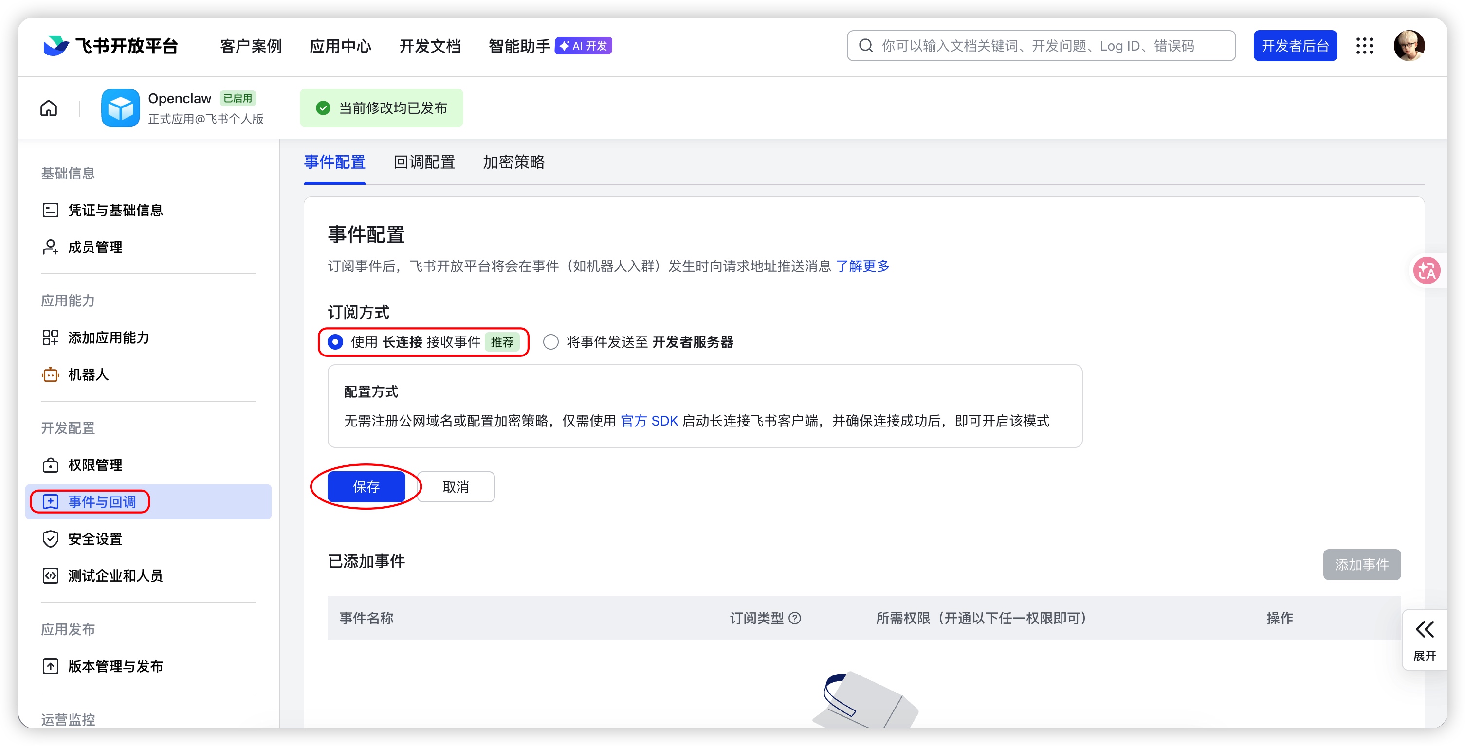 事件配置决定了飞书如何将用户消息转发给你的 OpenClaw 服务。