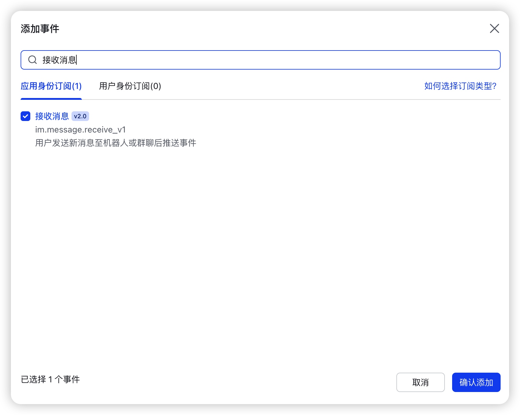 添加事件:点击页面中的 “添加事件”,在弹出的事件列表中,选择 “消息与群组” 分类,勾选 “接收消息”,点击 “确定”,完成事件订阅。