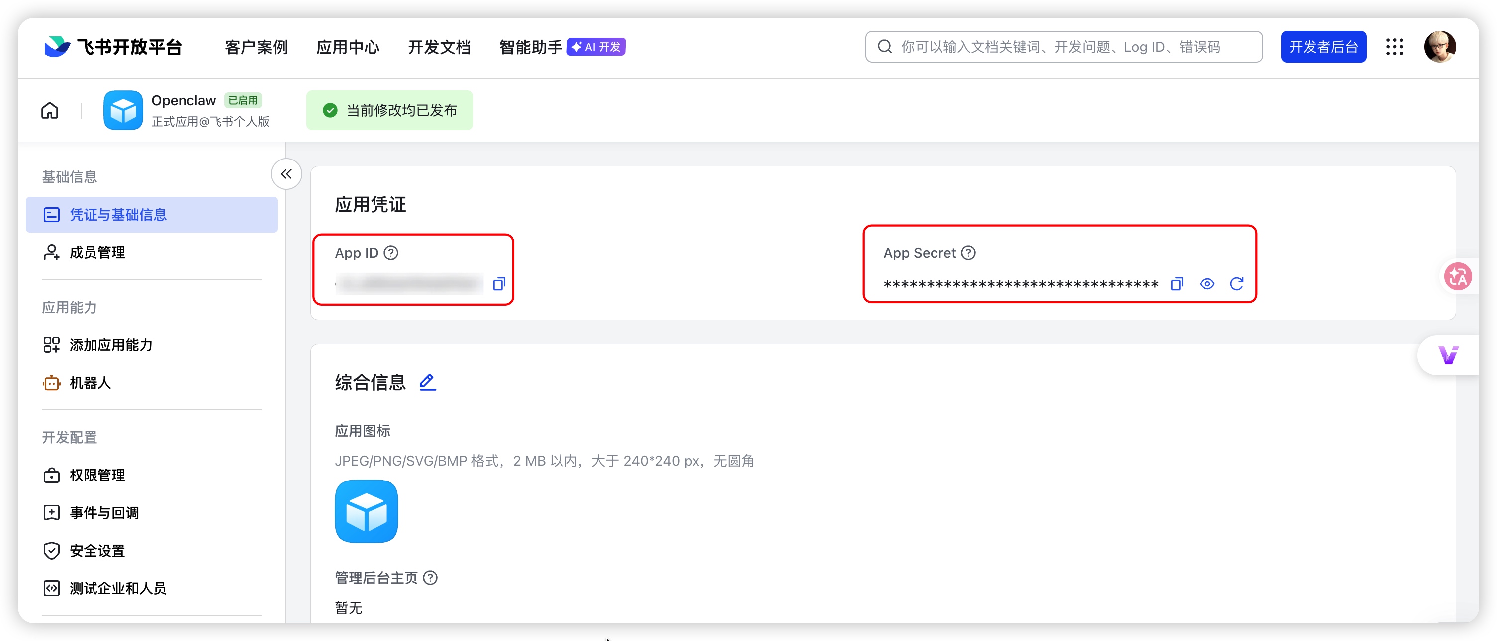 创建后进入应用详情页,点击“凭证与基础信息”,获取App ID和App Secret。