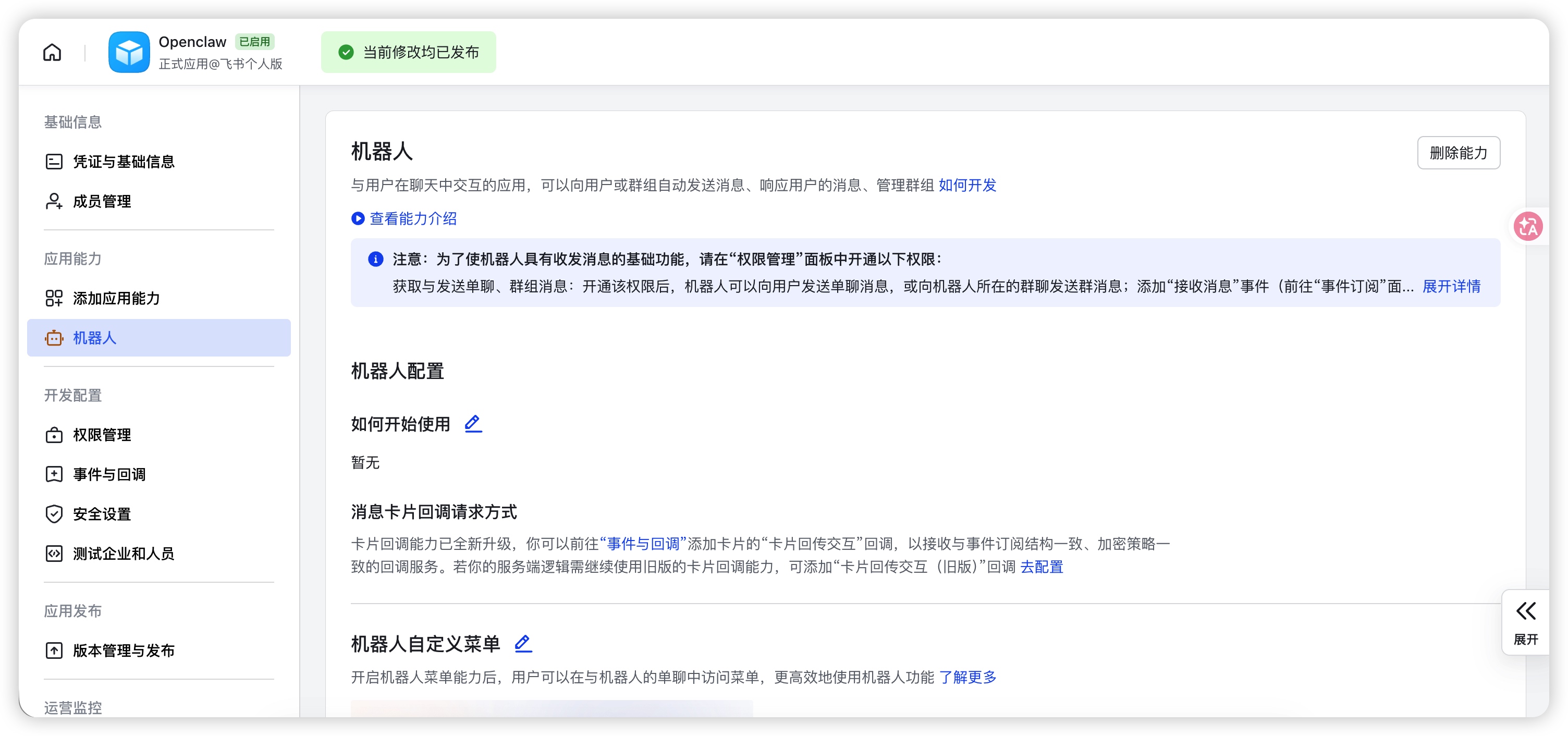 完成基础配置后,我们需要在飞书开放平台进行更详细的权限和事件配置,分为三个部分:事件配置、权限配置、应用发布。