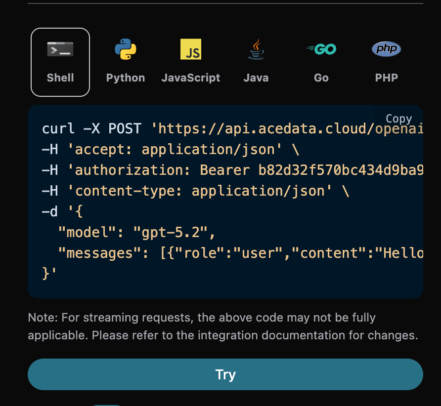 同时您可以注意到右侧有对应的调用代码生成,您可以复制代码直接运行,也可以直接点击「Try」按钮进行测试。