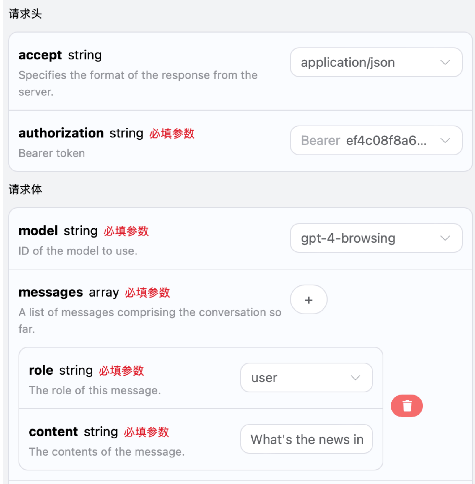 gpt-3.5-browsing 和 gpt-4-browsing 模型与其它模型不同,它可以根据提问词来进行联网搜索,并且将联网搜索的结果进行适当的调整返回给你,本文将通过一个具体示例来演示联网功能,接下来就可以在 OpenAI Chat Completion API 界面上填写对应的内容,如图所示: