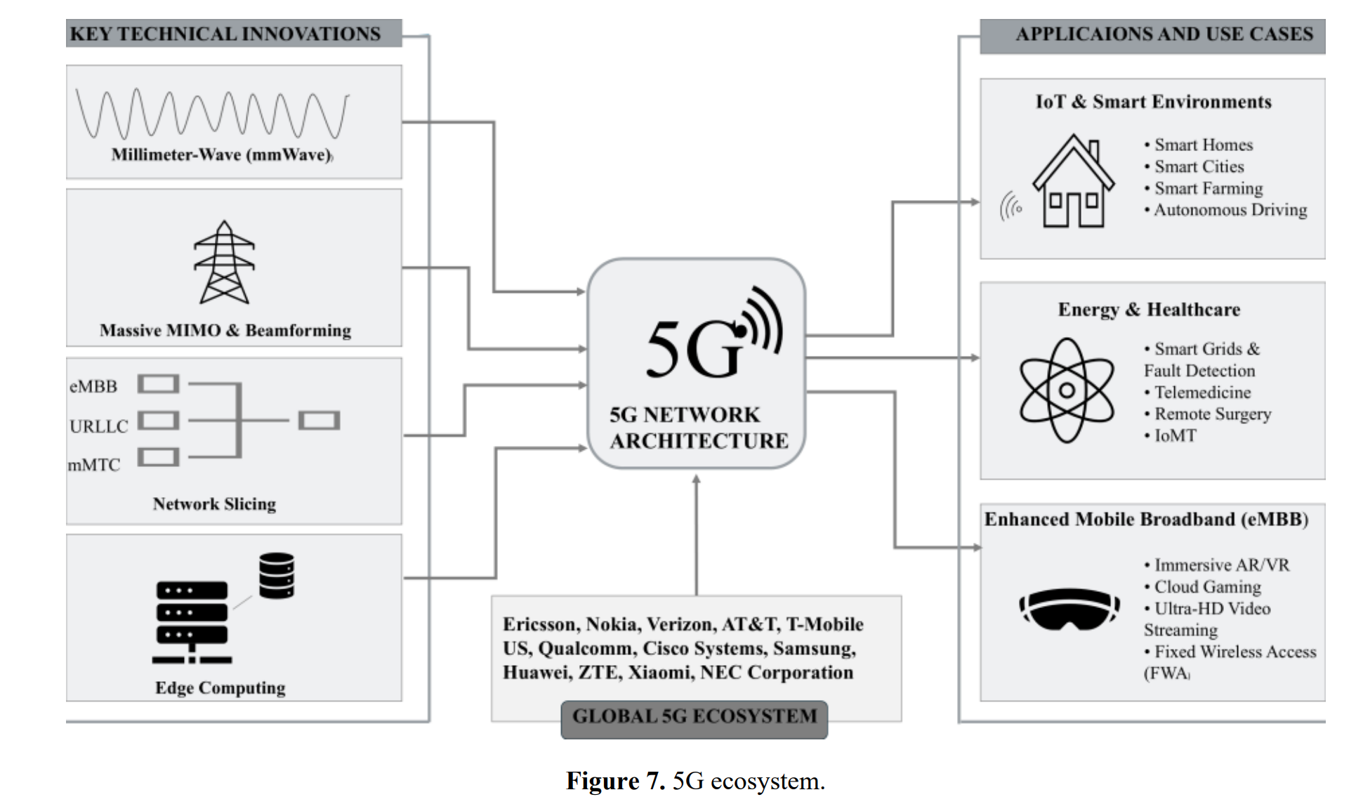 第五代移动网络代表无线通信领域的重大进步,旨在满足对更高数据速率、超低延迟、海量设备连接和增强可靠性的日益增长的需求。与以往世代不同,5G不仅仅是速度更快,还能支持自动驾驶汽车、远程手术、AR/VR和工业自动化等新应用场景]。为支持图7所示的多元化利益相关者与应用生态系统,5G通过以下关键创新实现这些功能,包括: