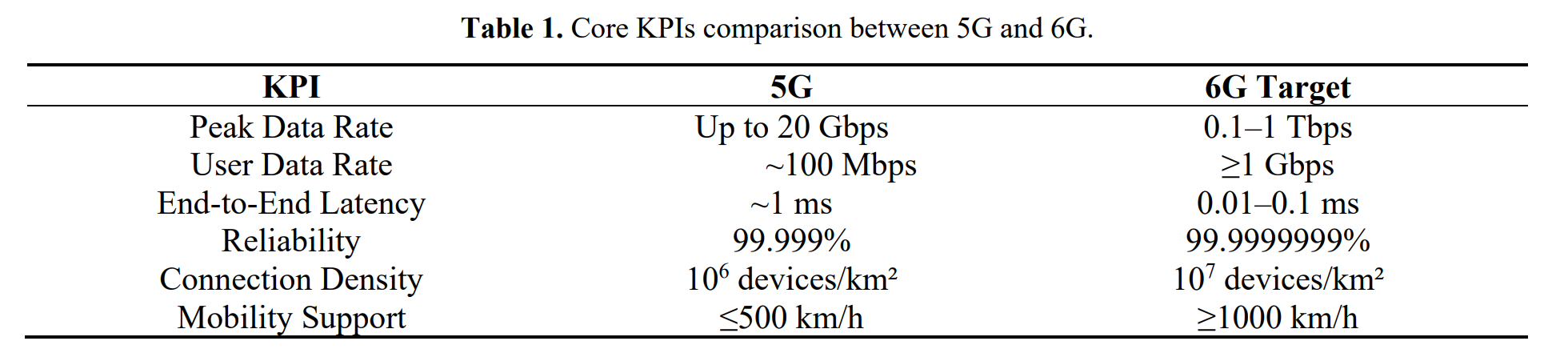 随着超智能连接需求的增长,5G的局限性逐渐显现,6G无线系统的愿景作为一种变革性范式应运而生,旨在满足未来数字社会前所未有的需求。预计2030年左右商业化,6G将提供超高数据速率、超低延迟和泛在连接,性能比5G高出数个数量级。根据当前研究共识,6G的目标KPI在几乎所有维度上均显著超越5G,详细对比见表1。这些指标旨在支持实时XR、高精度工业控制、3D全息和触觉互联网服务等颠覆性应用。