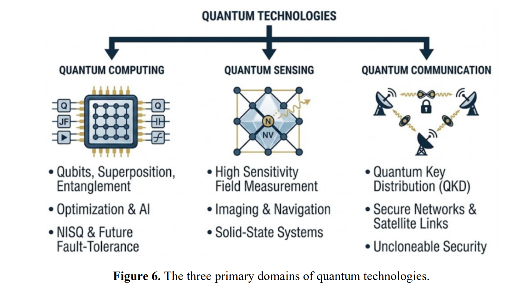 量子技术在信息处理、测量和安全通信方面带来了深刻变革。与经典系统不同,量子设备利用叠加、纠缠和干涉等基本原理,突破传统物理和工程的限制。其变革潜力涵盖优化、药物研发、传感和网络安全等多个工业领域,既带来科学突破,也创造商业机会。图6展示了量子技术的三个主要领域:量子计算、量子传感和量子通信。
