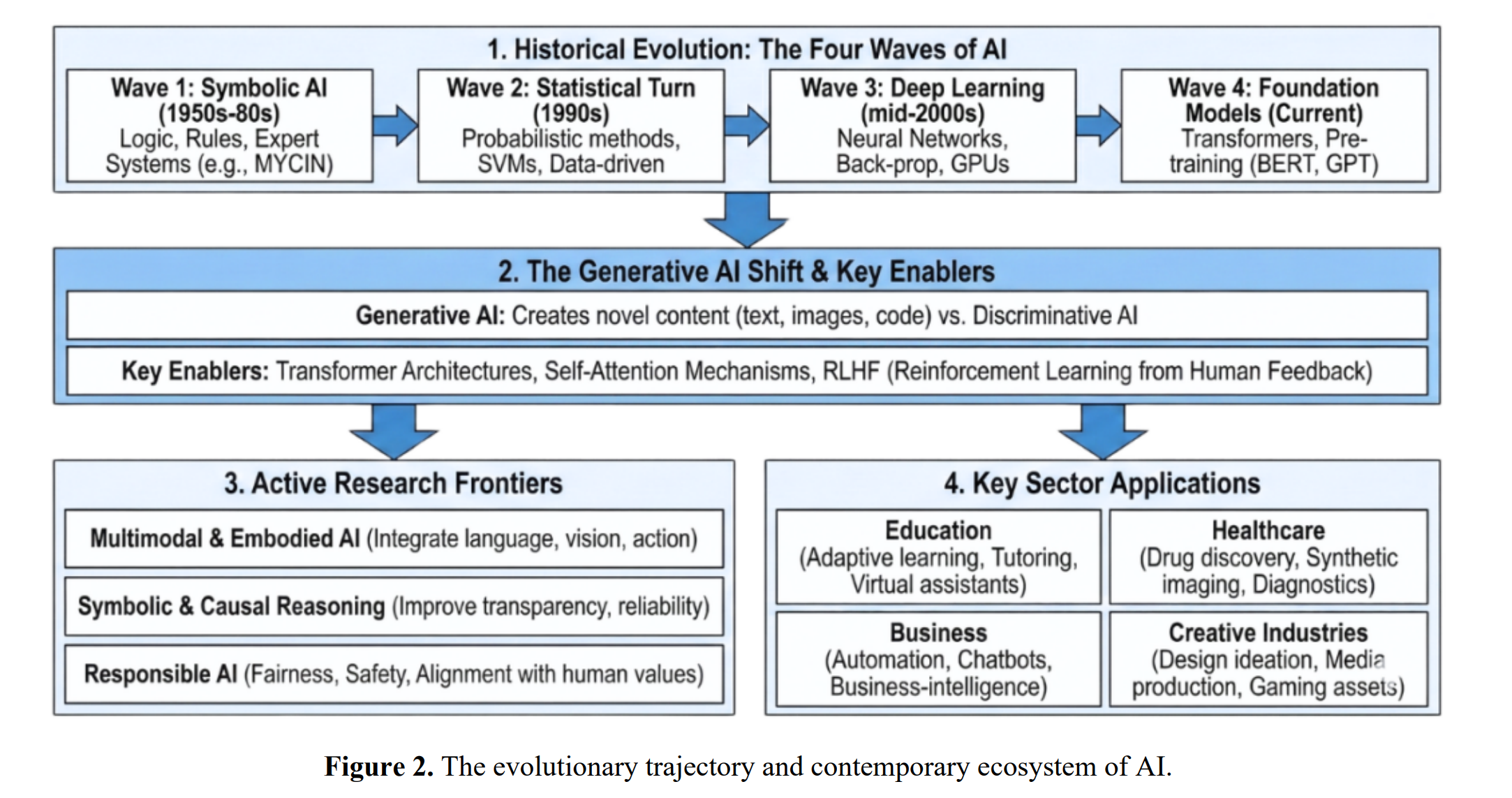 近期的AI研究越来越关注开发不仅准确、可扩展,而且可泛化、可解释且符合社会价值观的系统。其中一个重要方向是基础模型——在海量数据集上训练的大型神经架构,能够跨领域执行多种任务。这些模型在语言理解、视觉-语言对齐和代码生成方面表现出色,但也引发了关于效率、可控性及伦理使用的新问题。另一个活跃领域是多模态与具身AI,旨在整合语言、视觉和行动以支持更类人的感知与交互。同时,研究人员正在重新审视符号推理和因果推断,以提高透明度和决策可靠性,尤其是在安全关键型应用中。除了这些技术目标外,负责任AI也日益受到关注,其核心原则强调公平性、鲁棒性以及符合人类价值观。图2展示了这一历史进程及现代格局,描绘了AI的演化轨迹与当代生态系统。