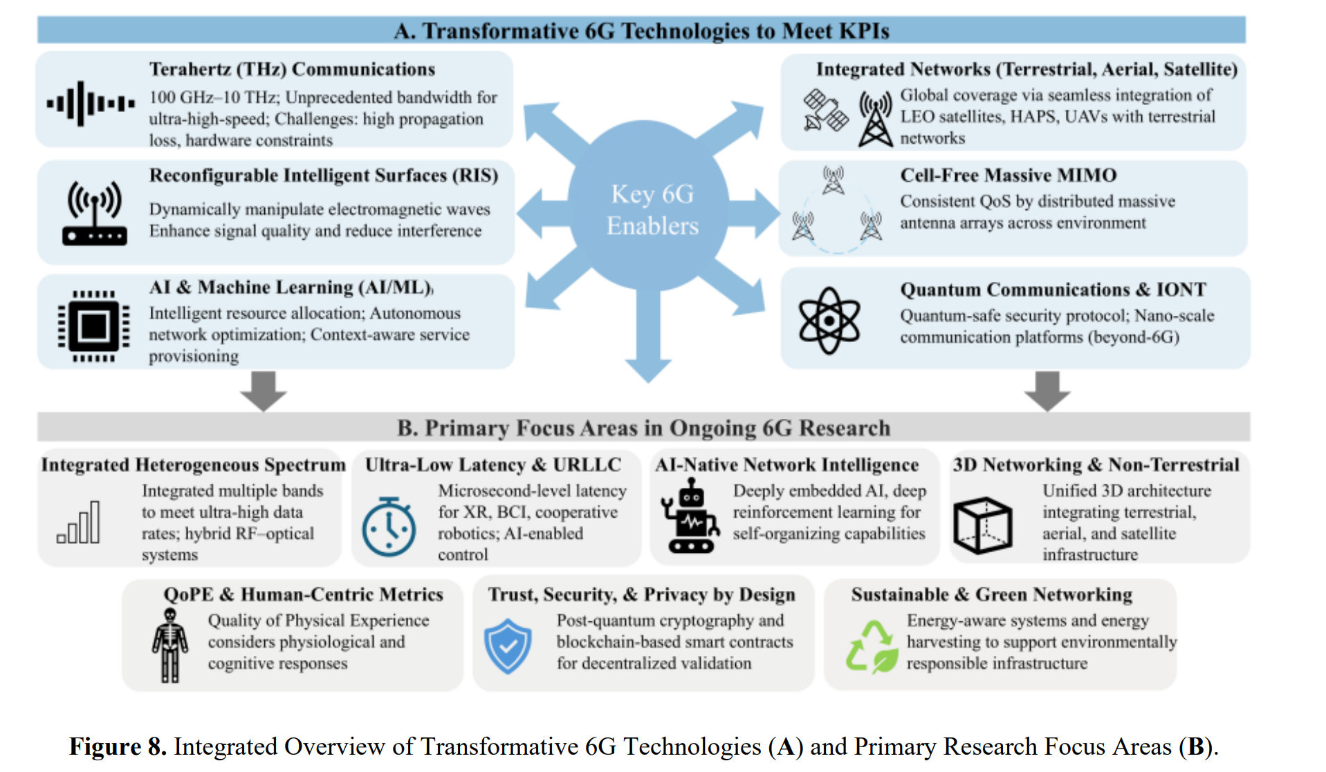 • 可持续与绿色网络:另一重点是设计节能系统和能量收集技术,包括优化资源利用、边缘计算部署及整合环境能量收集方法,以支持环保型6G基础设施。