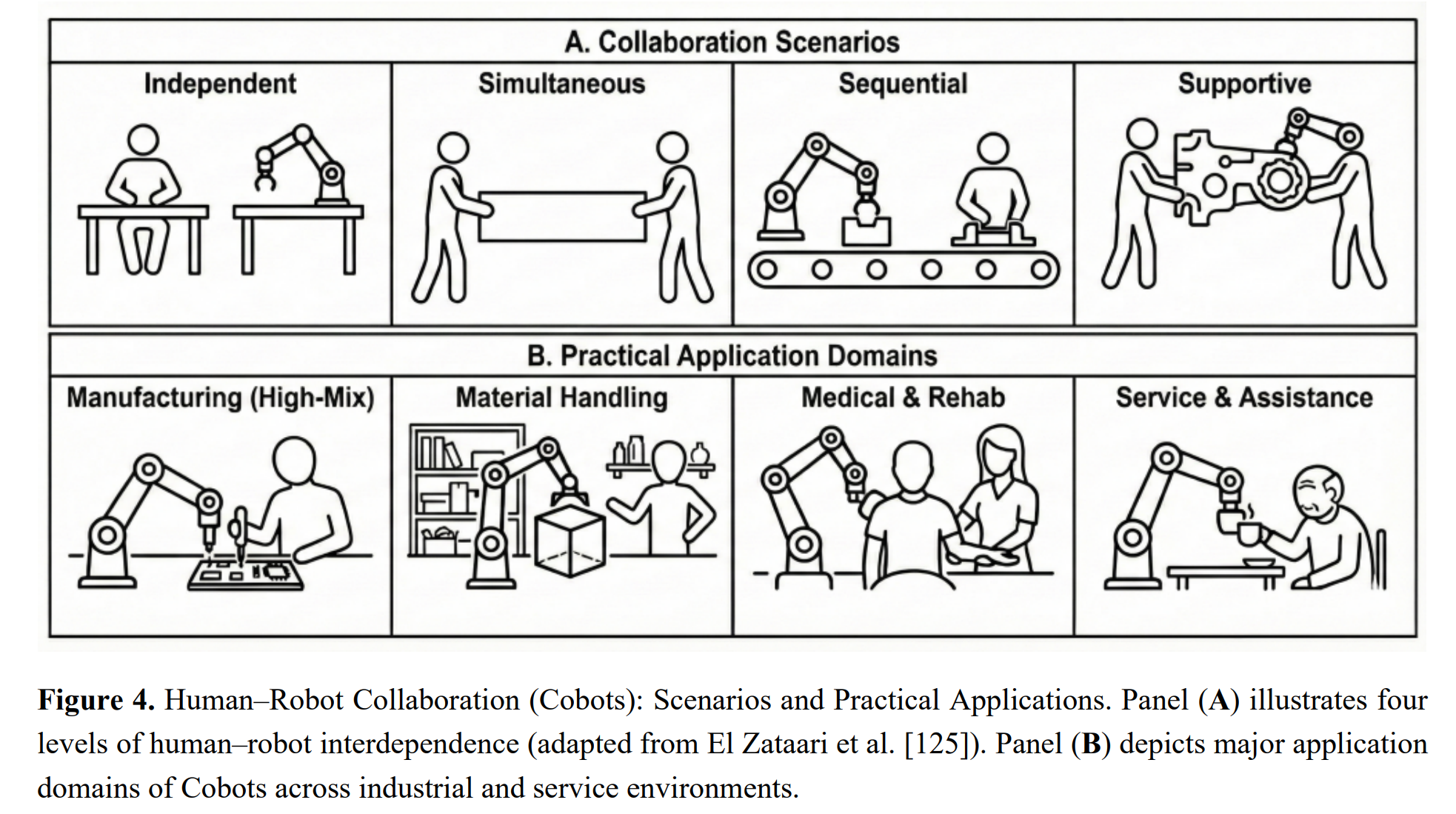 El Zataari等人[125]确定了四种不同的协作场景,定义了操作员与Cobots在共享工业工作空间中的交互方式。这些配置反映了人机协作中日益增长的相互依赖性和认知需求,如图4A所示:
