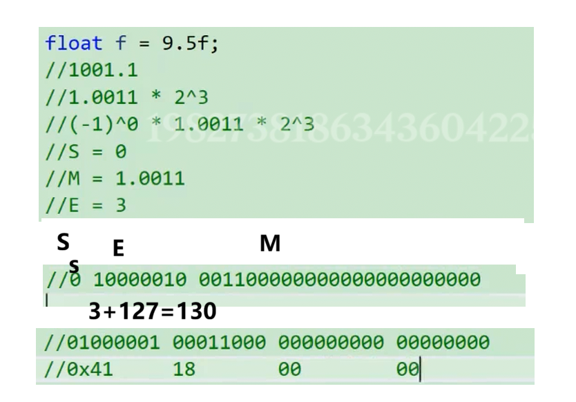 对于32位的浮点数(float),最⾼的1位存储符号位S,接着的8位存储指数E,剩下的23位存储有效数字 M