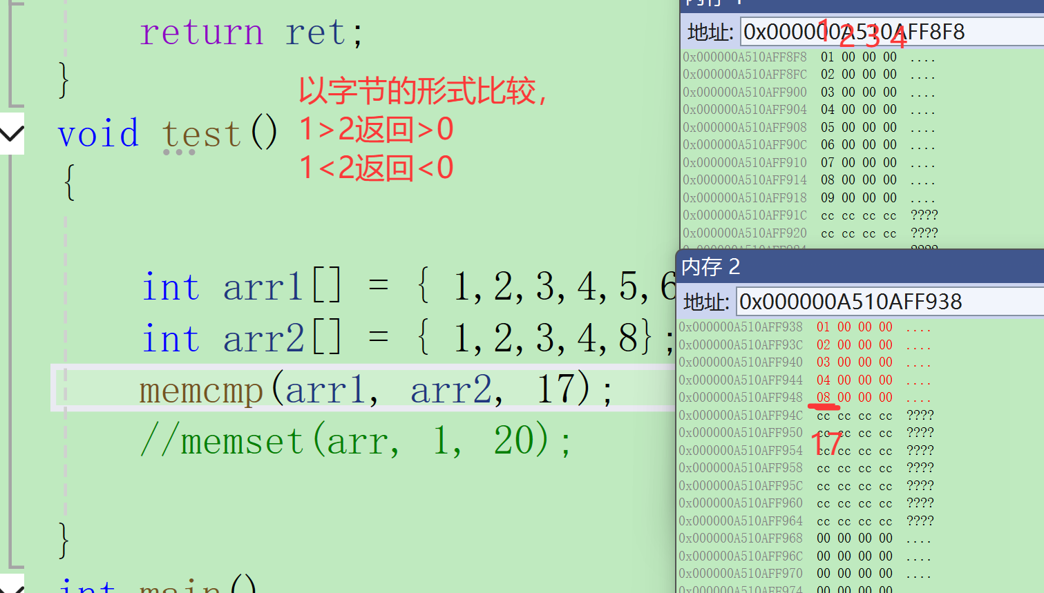 int memcmp ( const void * ptr1, const void * ptr2, size_t num );