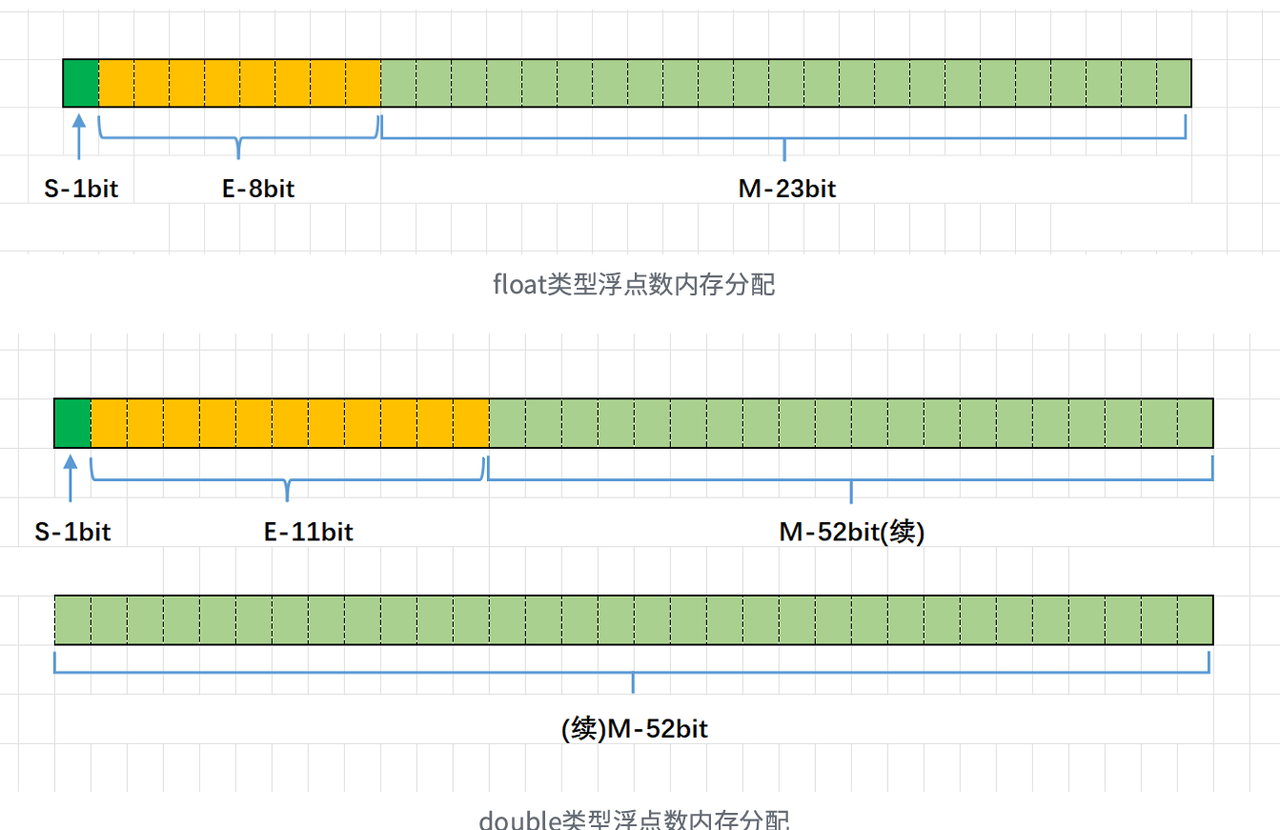 对于64位的浮点数(double),最⾼的1位存储符号位S,接着的11位存储指数E,剩下的52位存储有效 数字M