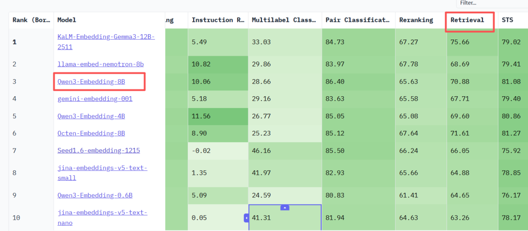 可以看到以上这2个指标,其实我们都不太容易用自己的数据集去评估,可直接参考HuggingFace 的 MTEB leaderboard,一站式的文本 Embedding 模型榜,我们可以了解每个模型的平均性能。