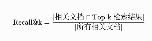准确率指标 Recall@K : recall 指召回率, Recall@K 指Top-K 召回率,在所有真正相关的文档中,模型成功排在前K位的比例是多少,高 Recall意味着模型漏掉的结果很少