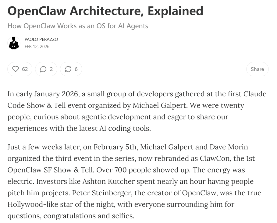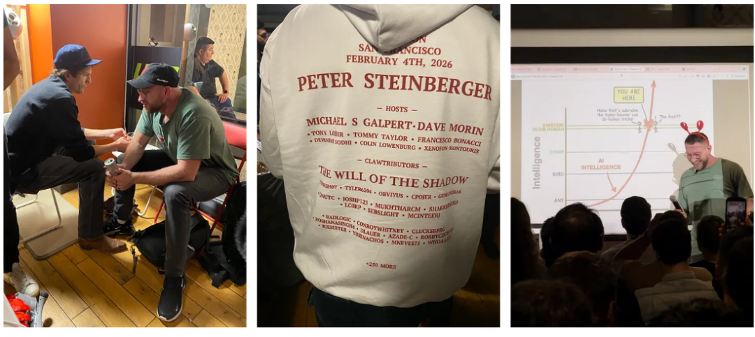短短几周后的2月5日,Michael Galpert和Dave Morin组织了该系列的第三场活动,现已更名为ClawCon——首届OpenClaw旧金山展示会。超过700人到场参加。现场气氛热烈,Ashton Kutcher等投资人花了近一个小时听人们展示项目。OpenClaw的创始人Peter Steinberger成为当晚真正的明星,所有人都围着他提问、祝贺并合影。