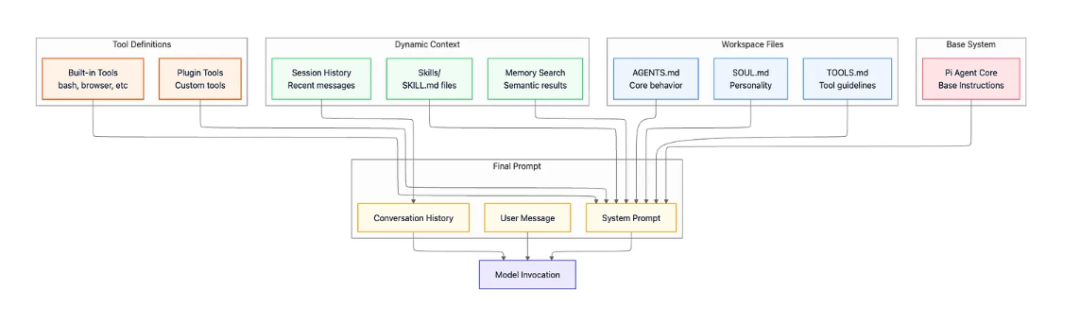 上下文组装:通过读取工作区中的AGENTS.md、SOUL.md和TOOLS.md组装系统提示,注入相关技能,并查询内存搜索系统以查找语义上类似的过去对话,这些对话可能提供有用的上下文。