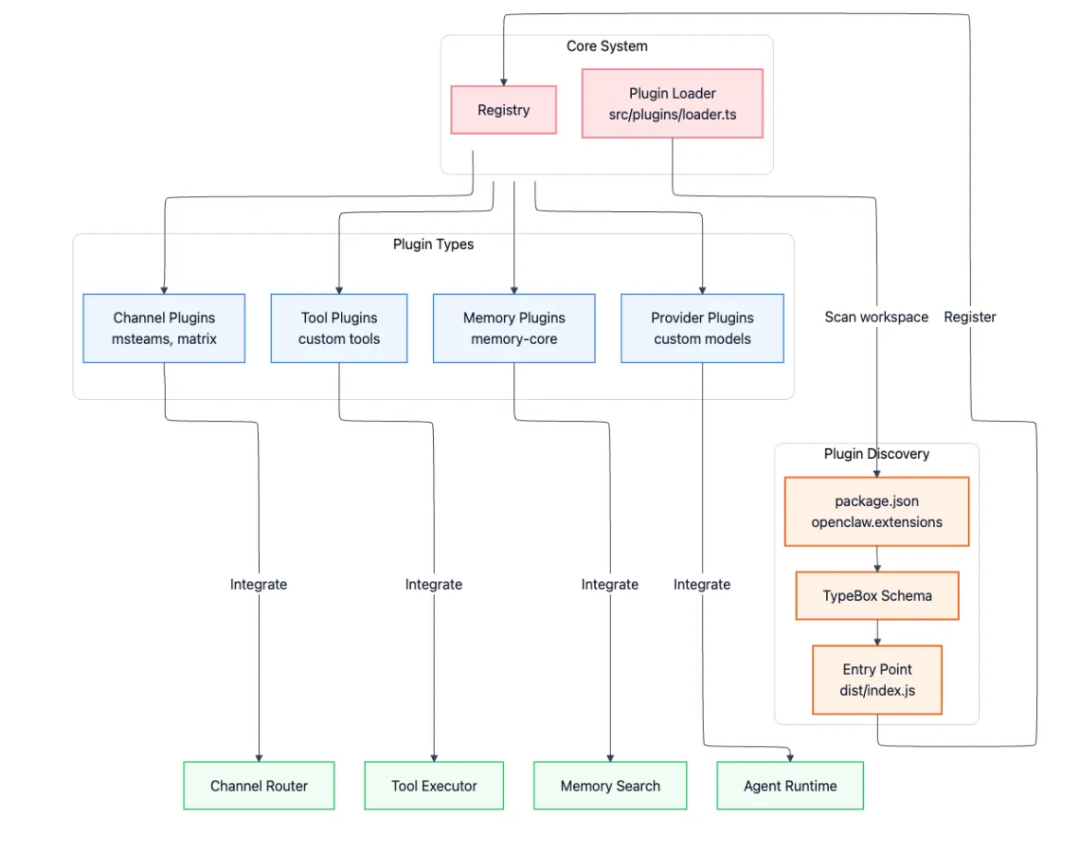 插件系统位于extensions/中,遵循基于发现的模型。src/plugins/loader.ts中的插件加载器扫描工作区包中package.json的openclaw.extensions字段,根据声明的模式验证,并在配置存在时热加载。