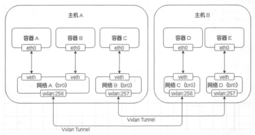 容器A、B、C都在主机A上面,而容器D、E则在主机B上面,现在通过Overlay网络模型可以实现容器A、B、D处于同一个子网,而容器C、E则处于另一个子网中。