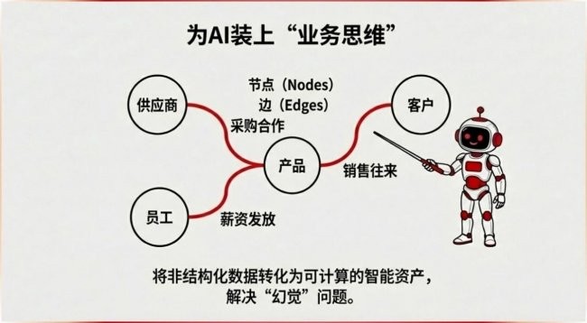 本次LOM的发布,就是以“定义边界、语义对齐、可追溯、可解释”为核心,为AI模型装上了“业务思维”。LOM将企业的供应商、客户、产品、员工等实体定义为“节点”,将采购合作、薪资发放、销售往来等关系定义为“边”,把分散的结构化和非结构化数据转化为可计算、可推理的智能资产,从根本上解决了大模型的“幻觉”问题。