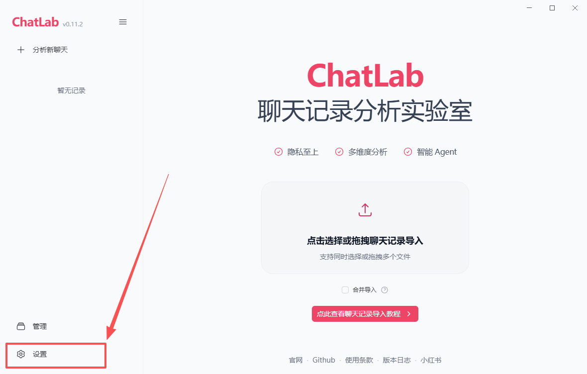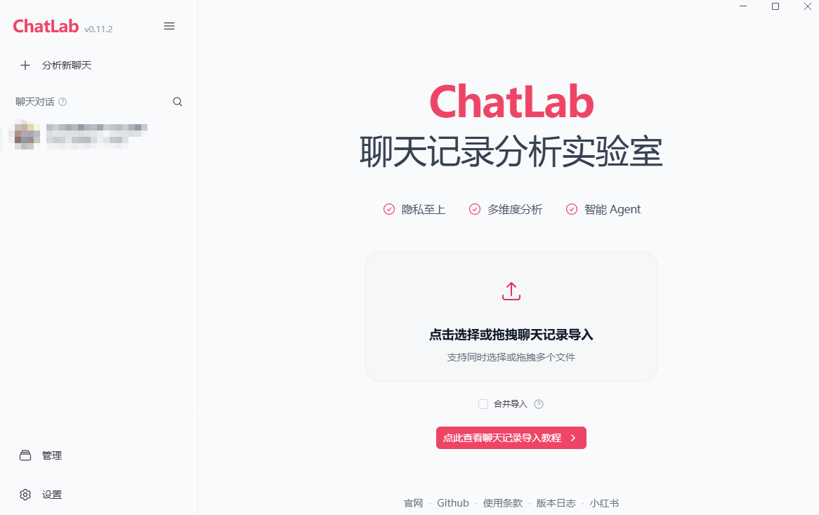 - 将导出的 JSONL 文件直接拖进去,等待 ChatLab 解析和索引构建。