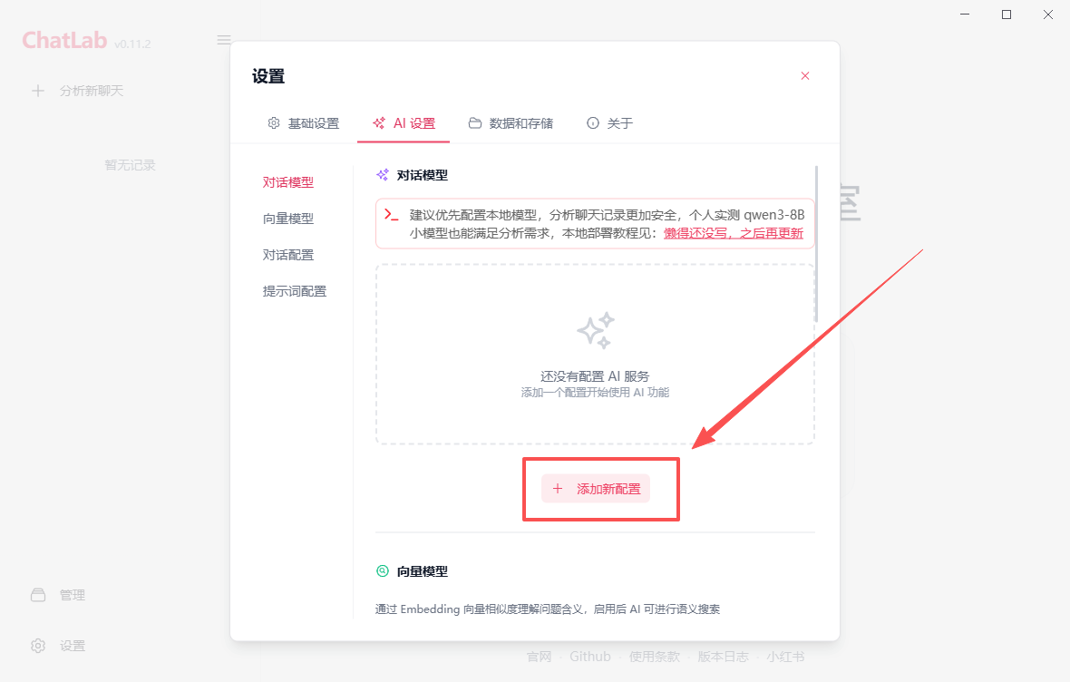 - 打开 ChatLab,进入右下角「设置 → AI 设置」。