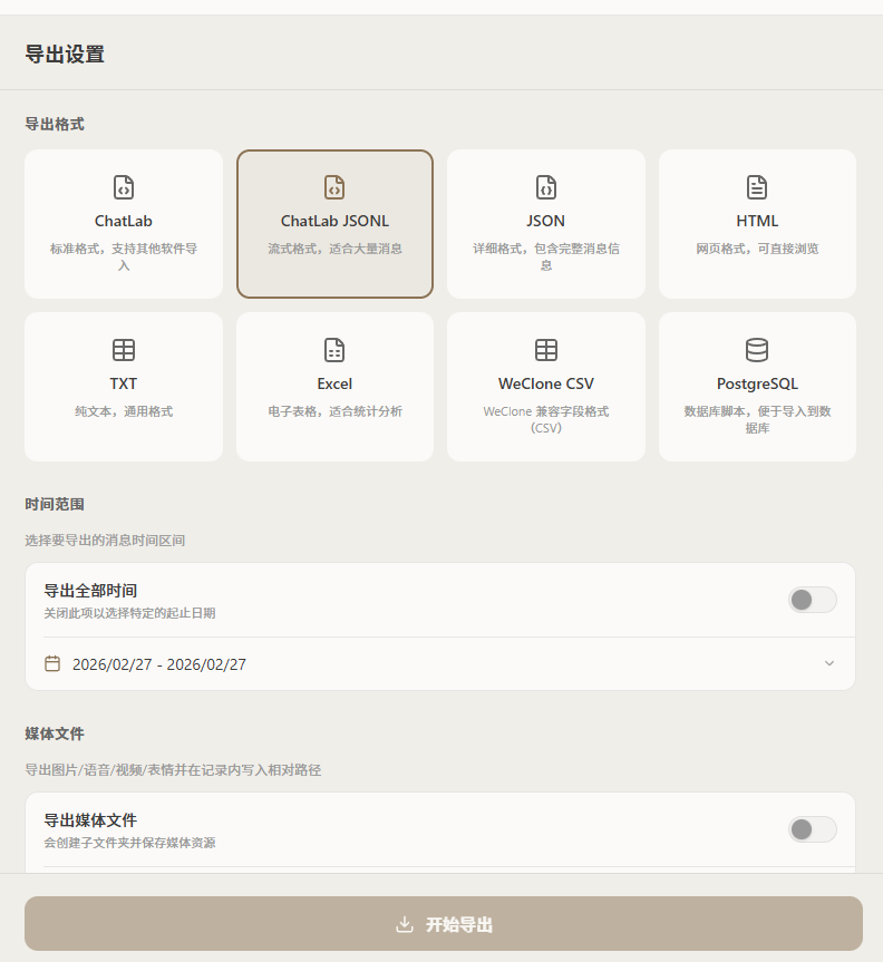 - 导出格式选择「ChatLab JSONL 格式」。