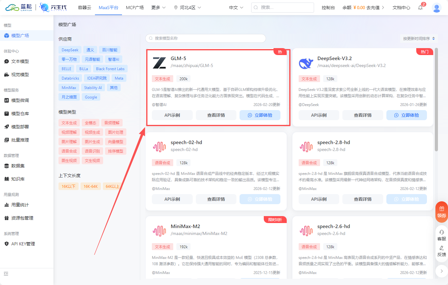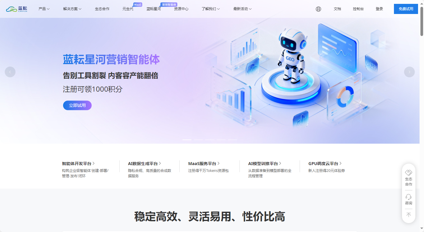 官网显示,蓝耘是专注于 GPU 算力云服务的平台,MaaS 平台在此基础上提供模型服务。
