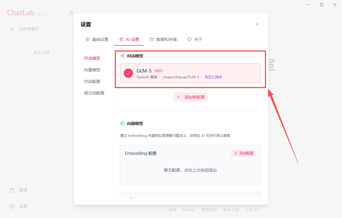 - 保存后,在 ChatLab 的 AI 对话框里,就可以选择这个配置进行问答了。