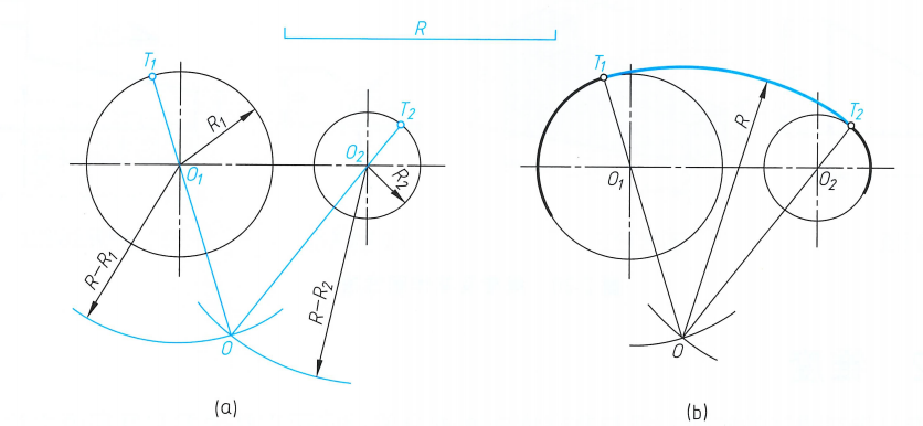 ①分别以01、O2为圆心,R+R1、R-R为半径画圆弧,两弧交点O即为连接圆弧的圆心;