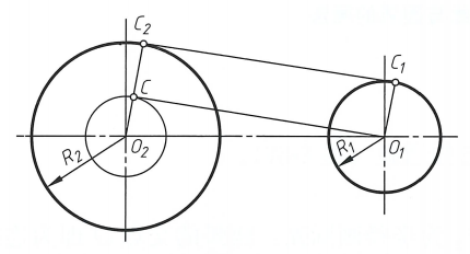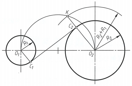 ②以O,为圆心,R2+R为半径作弧,与辅助圆相交于点K;连接O2K与O,圆交于C2;作OIC1//O,C2,连线C.C,即为所求异侧公切线。