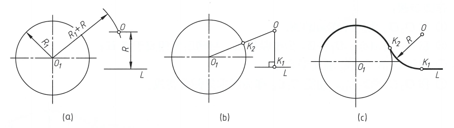 已知直线L和圆弧R,用半径为R的圆弧光滑连接已知直线和圆弧,要求与已知圆弧外切。