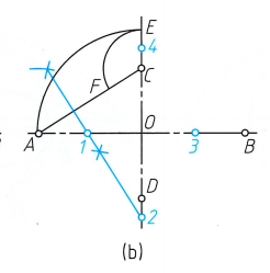 5、以1、2、3、4为圆心,分别以1A、2C、3B、4D为半径画圆弧,所画的四段圆弧在菱形延长线处光滑连接,即得近似椭圆。